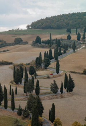 Classic Tuscan landscapes with rolling hills, cypress-lined roads, and golden fields, frequently featured in travel photography and films.